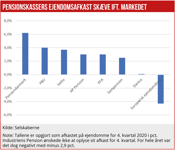 Men PensionDanmark vurderer alligevel, at deres ejendomme gav et afkast på hele 6,2 pct. i årets sidste kvartal, mens Danica kom ud med et plus på blot 0,1 pct. i afkast på sine ejendomsinvesteringer.