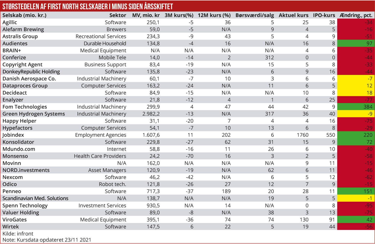 Økonomisk Ugebrevs statusopgørelse over performance for de seneste 29 noterede selskaber på First North er nedtrykkende. Store dele af landkortet er rødt: 19 af selskaberne har givet de nye aktionærer blodrøde afkast i forhold IPO-kursen. Kun 6 selskaber har givet rigtigt gode afkast. Men flere af succeserne har de seneste måneder vist en negativ tendens. Chefredaktør Morten W. Langer gennemgår resultaterne.