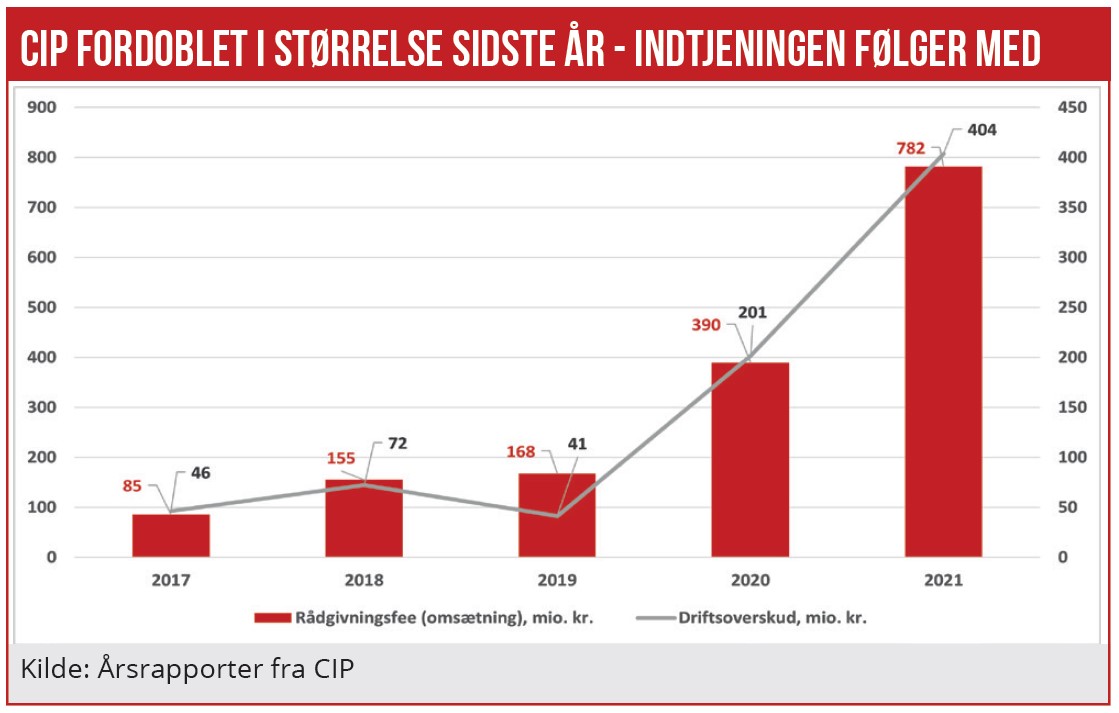 Alene sidste år fordoblede CIP indtægterne for at yde rådgivning til pensionskasserne, så de seks partnere i CIP nu modtager næsten 800 mio. kr. for at vise vej til de bedste investeringer i infrastruktur og grøn energi. Overskuddet blev også fordoblet i moderselskabet, til godt 400 mio. kr.
