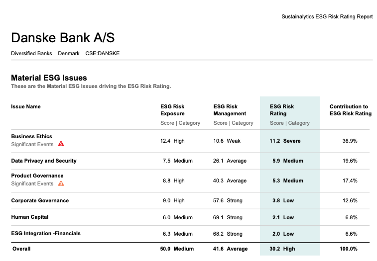 Den høje ESG-risikovurdering af Danske Bank afspejler ifølge Sustainalytics en ”ekstraordinært usædvanlig adfærd, høj hyppighed af hændelser og en virksomhed med dårlig styring af kontroversen.”