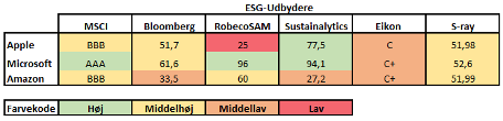 En gennemgang af seks globale ESG-ratingbureauers bæredygtige vurdering af Apple, Microsoft og Amazon viser meget forskellige resultater.  Apple tildeles for eksempel en meget lav ESG score af RobecoSAM men topkarakter af Sustainalytics.