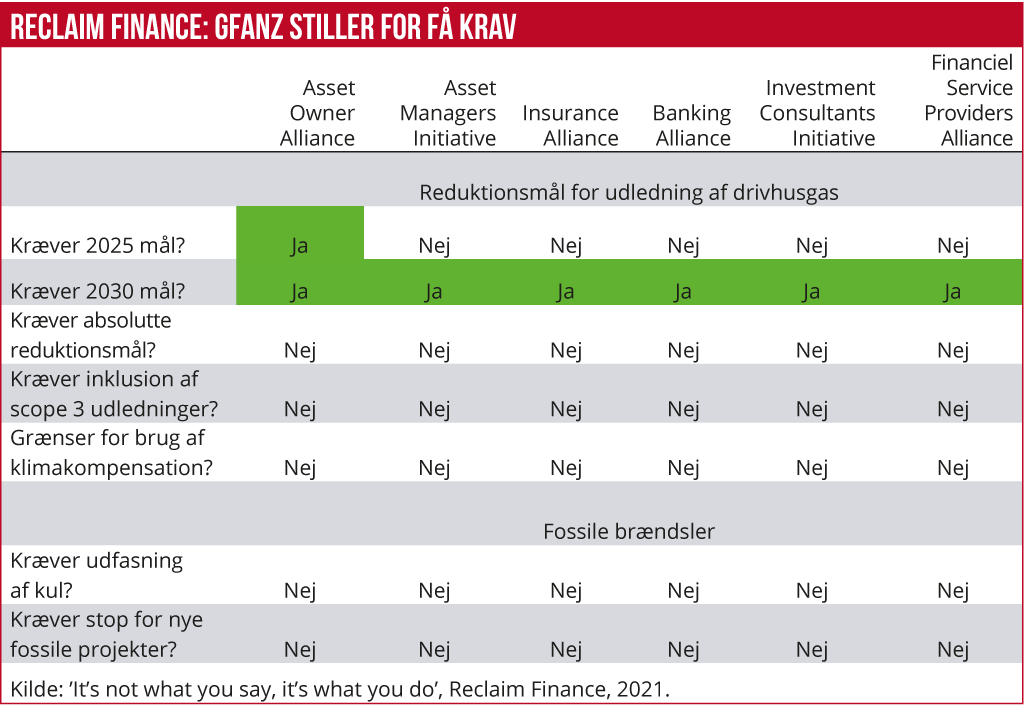 Det er dog langt fra alle, der betragter den globale finanssektors grønne alliance med samme forhåbninger som de to danske topdirektører. I en rapport retter Reclaim Finance – en nystiftet fransk ngo, der hovedsageligt drives af private fondsmidler og individuelle donationer – en skarp kritik af GFANZ, der blandt andet går på, at ingen af de syv branchespecifikke alliancer for alvor tager et opgør med den fossile industri – herunder at ingen af dem kræver stop for investering og finansiering af den mest klimatunge energiform, nemlig kul. Heller ikke nogen af alliancerne forlanger, at deres medlemmer holder op med at finansiere nye fossile produktionsanlæg.
