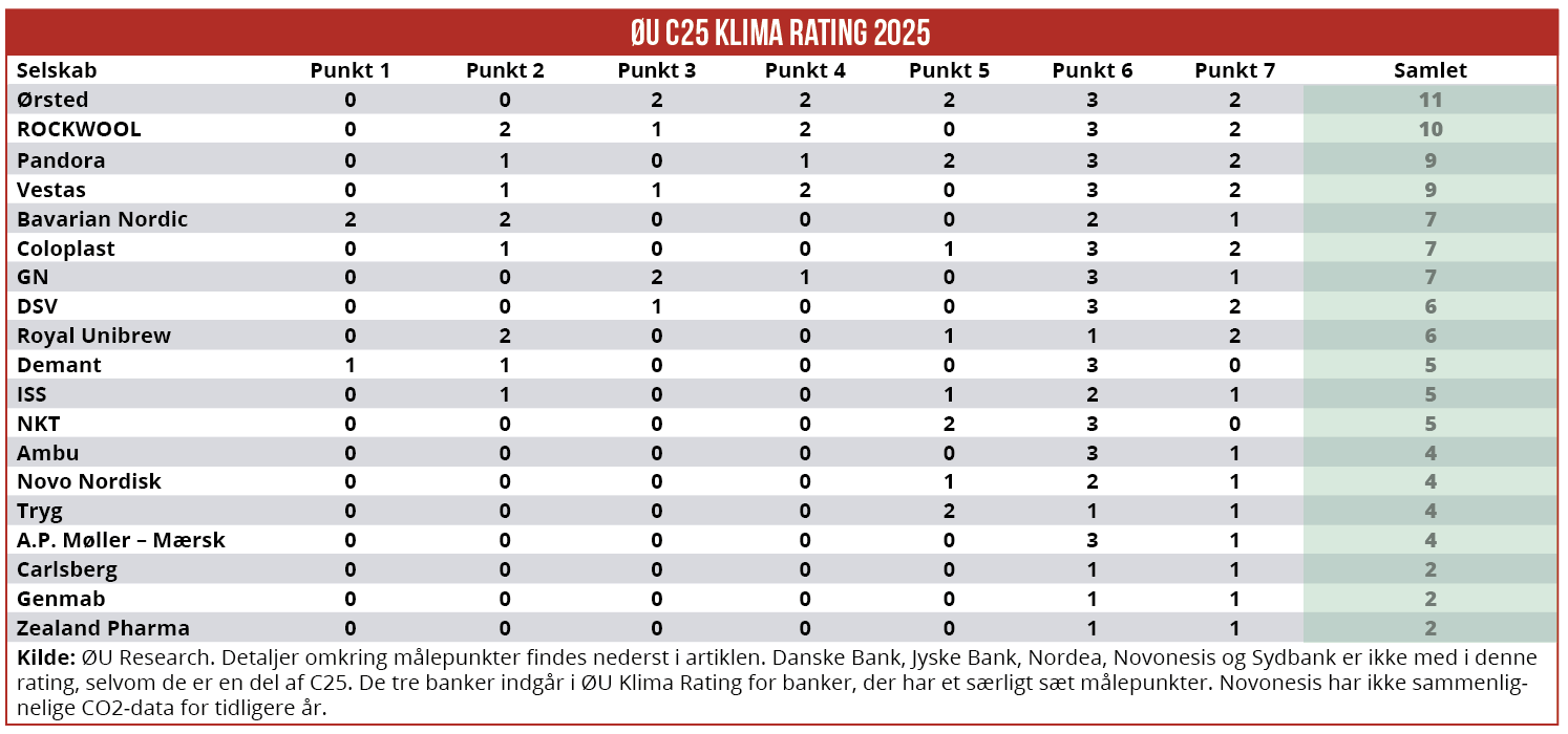 Ørsted vinder Økonomisk Ugebrevs årlige C25 Klima Rating med 11 point ud af 15 mulige. Lige efter følger ROCKWOOL, mens Pandora og Vestas indtager tredjepladsen. Tæt på bunden af ranglisten ligger Novo Nordisk og A.P. Møller-Mærsk med kun fire point, skriver redaktør Claus Strue Frederiksen i denne gennemgang af C25 Klima Rating 2025. Dette er artikel nummer to i Økonomisk Ugebrevs årlige Klima Rating, som omfatter over 50 danske selskaber, herunder store unoterede selskaber.