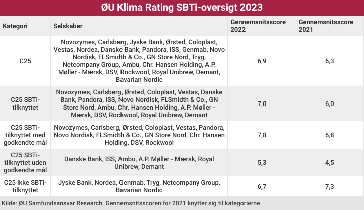De atten C25-selskaber, knyttet til guldstandarden SBTi, opnår en gennemsnitlig score på 7,0 point, hvilket blot er 0,1 point bedre end C25-snittet på 6,9. Dette resultat er dog væsentligt bedre end sidste år, hvor SBTi-selskaberne tilsammen fik en score på 6,0, hvilket var under C25-snittet på 6,3.