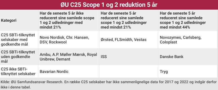 Det er værd at bemærke, at selvom Rockwool og Novozymes, der begge har godkendte SBTi-mål, ikke har reduceret deres samlede CO2-aftryk med over 4,2 procent det seneste år, og derfor ikke opnår point i dette målepunkt, så har begge virksomheder reduceret deres samlede udledninger med henholdsvis 3,6 og 0,8 procent det seneste år. Derved er SBTi-selskaberne med godkendte mål faktisk endnu bedre til at reducere deres samlede CO2-aftryk, end ovenstående tabel indikerer.