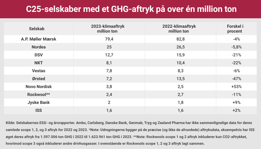 Hovedparten af de klimatunge C25 selskaber har det seneste år reduceret deres CHG-aftryk. A. P. Møller – Mærsk, DSV, NKT, Nordea, Rockwool, Vestas og Ørsted tilhører alle gruppen af C25-selskaber, der i 2023 havde et samlet GHG-aftryk på over en million ton og som det seneste år har reduceret deres klimaaftryk.