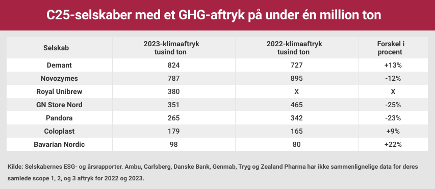 Syv C25 selskaber har i 2023 et samlet klimaaftryk på under en million ton GHG. Heraf har tre, nemlig GN Store Nord, Novozymes og Pandora, reduceret deres klimaaftryk det seneste år, mens Bavarian Nordic, Coloplast og Demant har øget deres aftryk. Royal Unibrew har ikke offentliggjort samlet aftryksdata for 2022.