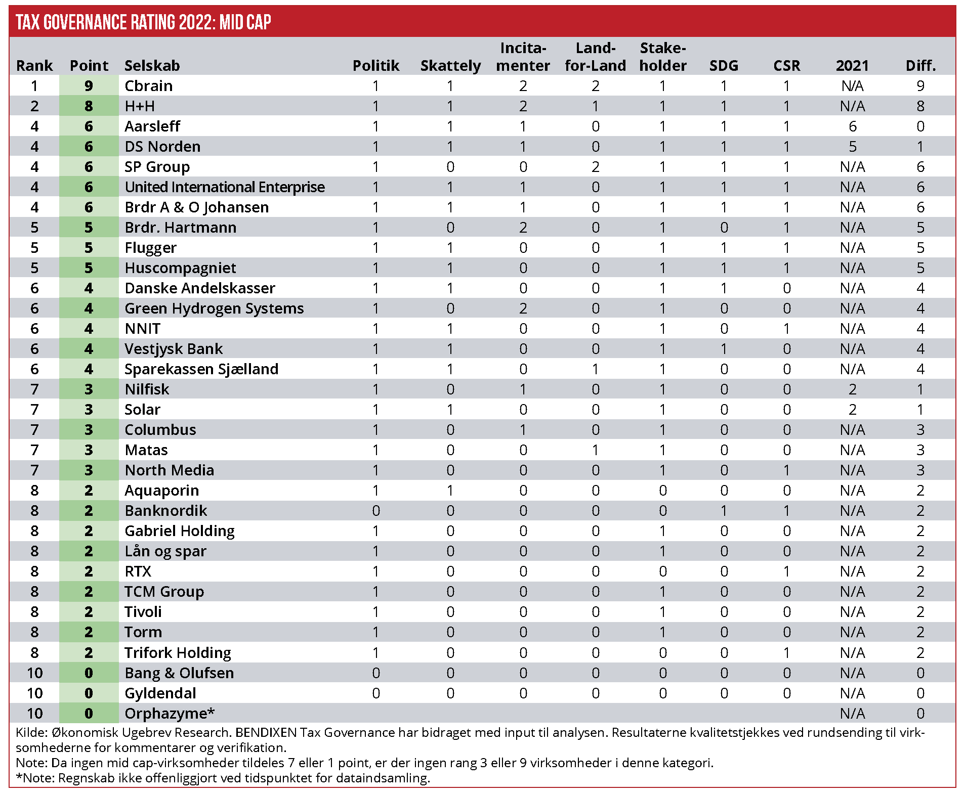 Mid cap-selskaberne cBrain og H+H indtager de øverste pladser i Økonomisk Ugebrevs Tax Governance Rating 2022. cBrain lægger sig helt i front med ni point ud af ni mulige, H+H scorer ét point mindre og ender således på otte point.  Brødrene A & O Johansen, DS Norden, SP Group, United International Enterprise og Aarsleff indtager de næste pladser, alle med 6 point.