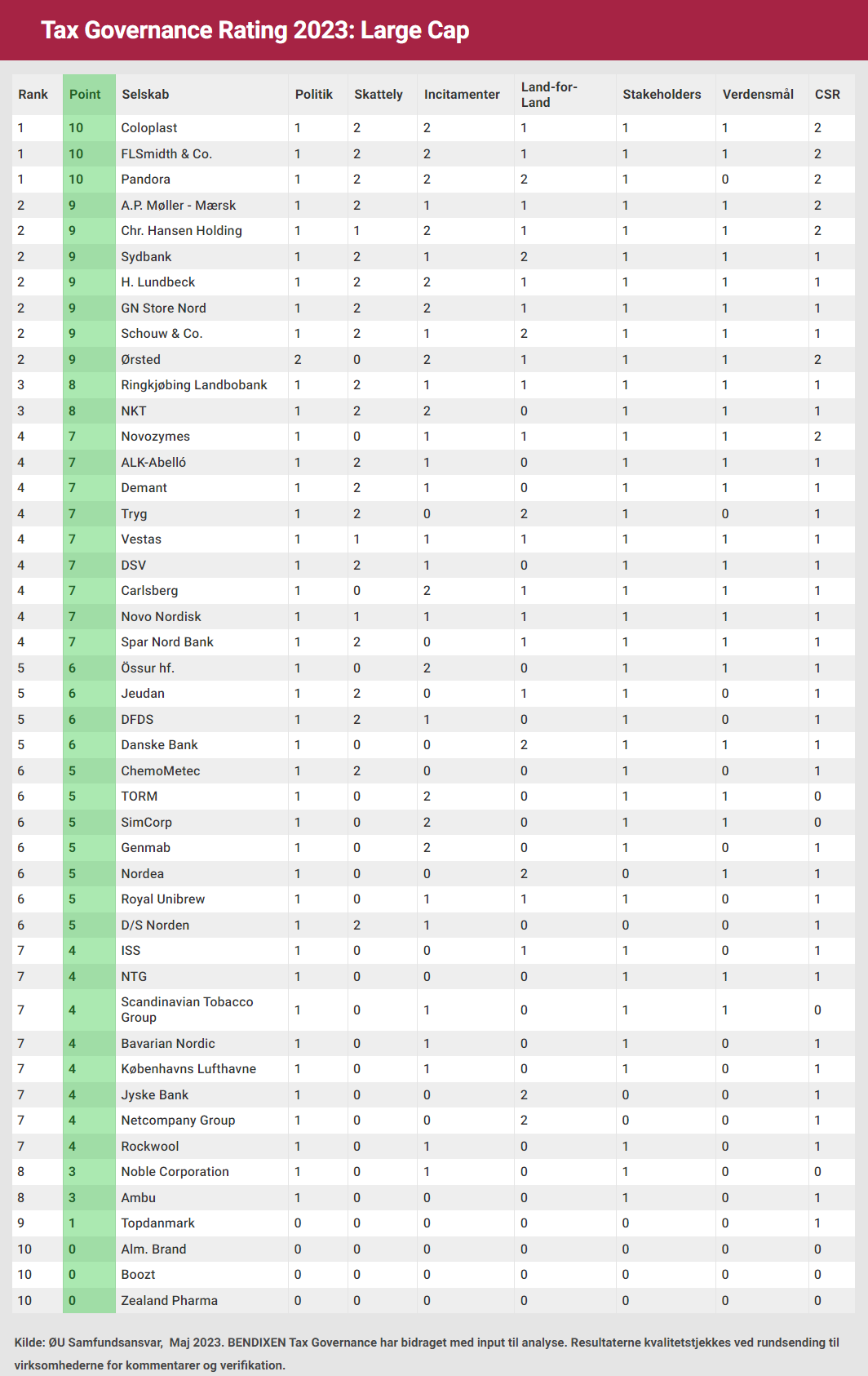 Der er trangt i toppen af Økonomisk Ugebrev Tax Governance Rating 2023. På førstepladsen med 10 point ud af 12 mulige ligger Coloplast, FLSmidth og Pandora skarpt efterfulgt af A. P. Møller – Mærsk, Chr. Hansen, GN Store Nord, Lundbeck, Schouw & Co., Sydbank og Ørsted, der alle opnår 9 point.*
