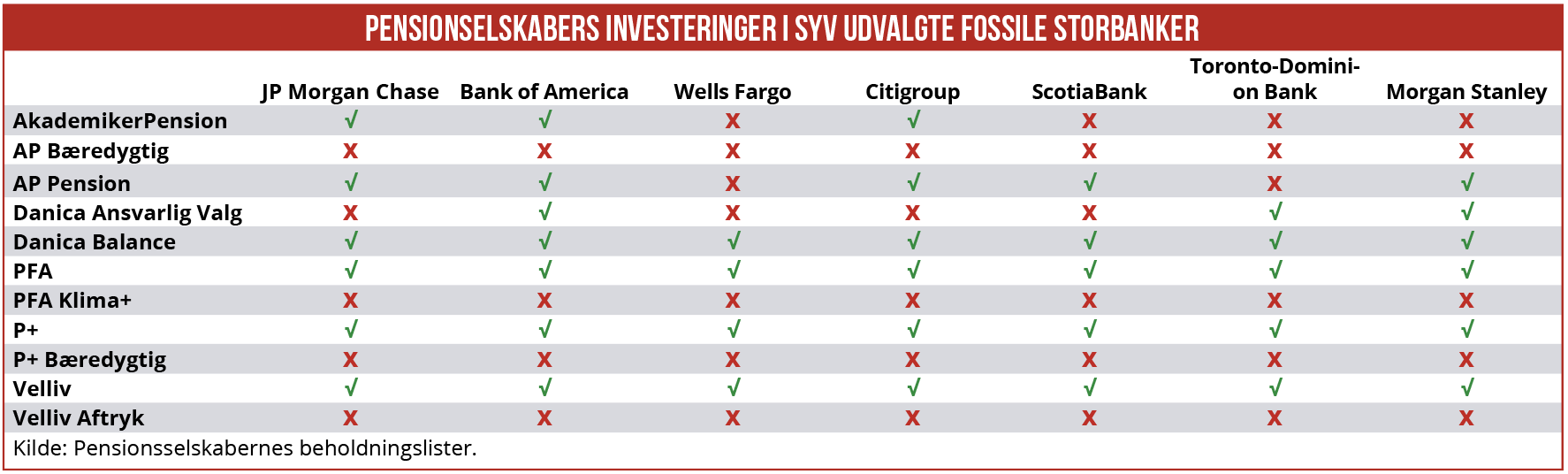 I Danica Pension er tilgangen en anden. Her optræder tre af de syv fossile nordamerikanske storbanker på beholdningslisten i det grønne tilvalgsprodukt, Danica Balance Ansvarligt Valg. Produktet har ellers skrappe krav, der blandt andet udelukker investeringer i en rækker sektorer, herunder alkohol, gambling, porno, tobak, kontroversielle våben og fossile selskaber.