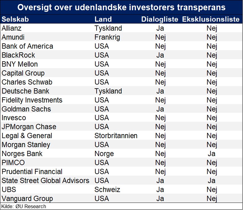 Udenlandske storinvestorer som BlackRock, Deutsche Bank og Vanguard er langt mindre transparente omkring eksklusion og engagement end deres danske investorkollegaer. Ifølge en undersøgelse, Økonomisk Ugebrev har udarbejdet, offentliggør blot fem procent af de udenlandske storinvestorer både en engagements- og eksklusionsliste. For store danske investorer er andelen 87 procent. Storinvestorer som Amundi og Morgan Stanley offentliggør hverken engagements- eller eksklusionslister, skriver redaktør Claus Strue Frederiksen