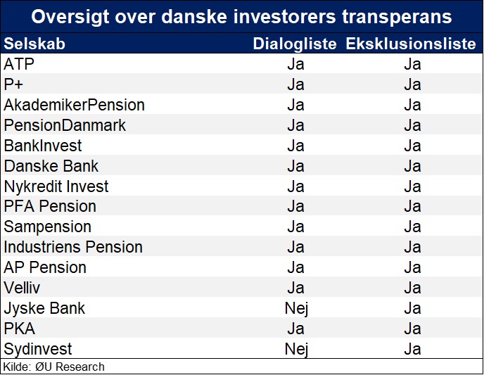 Som det fremgår af nedenstående tabel er de danske storinvestorer langt mere åbne end deres udenlandske kollegaer omkring, hvilke selskaber de bedriver engagement overfor og hvilke, de har ekskluderet fra deres investeringsunivers.