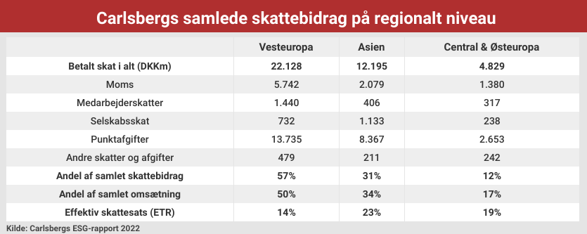Carlsberg skelner i sin opgørelse ikke klart mellem afholdte og opkrævede skatter. Og vil man vide, hvad Carlsbergs samlede skattebidrag er i lande som f.eks. Danmark, så overlades man til fantasien. Som det fremgår af nedenstående tabel opdeler bryggerigiganten nemlig kun sit globale skattebidrag i tre regionale kategorier.