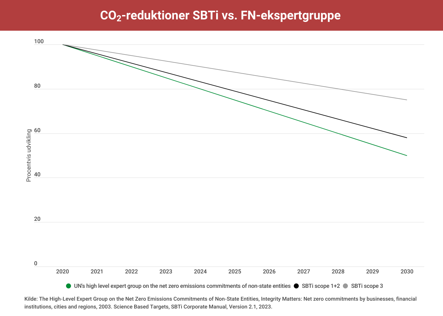 I en rapport sætter en række FN-eksperter dog barren en del højere end SBTi. Ifølge ekspertgruppen skal virksomheder reducere deres CO2-aftryk med 5 procent om året: “Non-state actors [including businesses, red.] must have short-, medium- and long-term absolute emissions reduction targets (…) that limit warming to 1.5°C with no or limited overshoot, and where global emissions decline at least 50% below 2020 levels by 2030, reaching net zero by 2050 or sooner.”