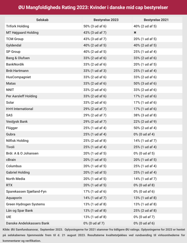 ØU Mangfoldigheds Rating 2023: Som eneste danske mid cap-selskab har it-selskabet Trifork lige mange kvinder og mænd i bestyrelsen. Samtlige andre 31 mellemstore børsnoterede danske virksomheders bestyrelser er domineret af mænd. Ifølge Erhvervsstyrelsen definition af kønslighed er det imidlertid hele 19 af de danske mid cap-selskaber, der har kønslighed i bestyrelsen. Det gælder eksempelvis SAS, hvis bestyrelse har to kvinder og fem mænd, hvilket ifølge Erhvervsstyrelsen er udtryk for en ligelig kønsfordeling. Redaktør Claus Strue Frederiksen leverer et overblik over kvindeandelen i danske mid cap-selskabers bestyrelser.