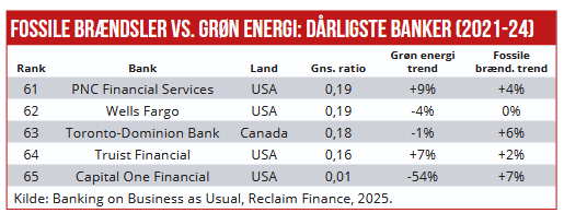Særligt US-banker og canadiske banker trækker gennemsnittet ned. Helt i bunden af listen ligger den amerikanske storbank Capital One Financial, med en ratio på 0,01. Altså: Når banken har ydet én krone i finansiering til grøn energiforsyning, har den ydet 100 kroner til fossil energi.