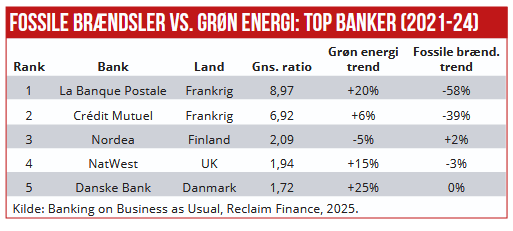 Ifølge en ny undersøgelse har 65 storbanker i perioden 2021-24 samlet set ydet 8.725 milliarder kroner i finansiering til grøn energiforsyning – samtidig har de ydet 20.953 milliarder kroner i finansiering til fossil energi. Hver gang bankerne har yder én krone i finansiering til fossil energi, har de ydet 0,42 kroner til grøn energiforsyning, altså en ratio på 0,42.