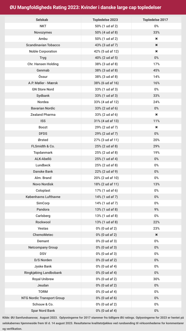 Næsten hver tredje danske large cap-selskab har ingen kvinder i executive management. Udover NTG og de tre omtalte banker består topledelsen i Demant, DSV, Netcompany, Vestas, Jeudan, D/S Norden, Royal Unibrew, Schouw & Co., Torm og ChemoMetec udelukkende af mænd.
