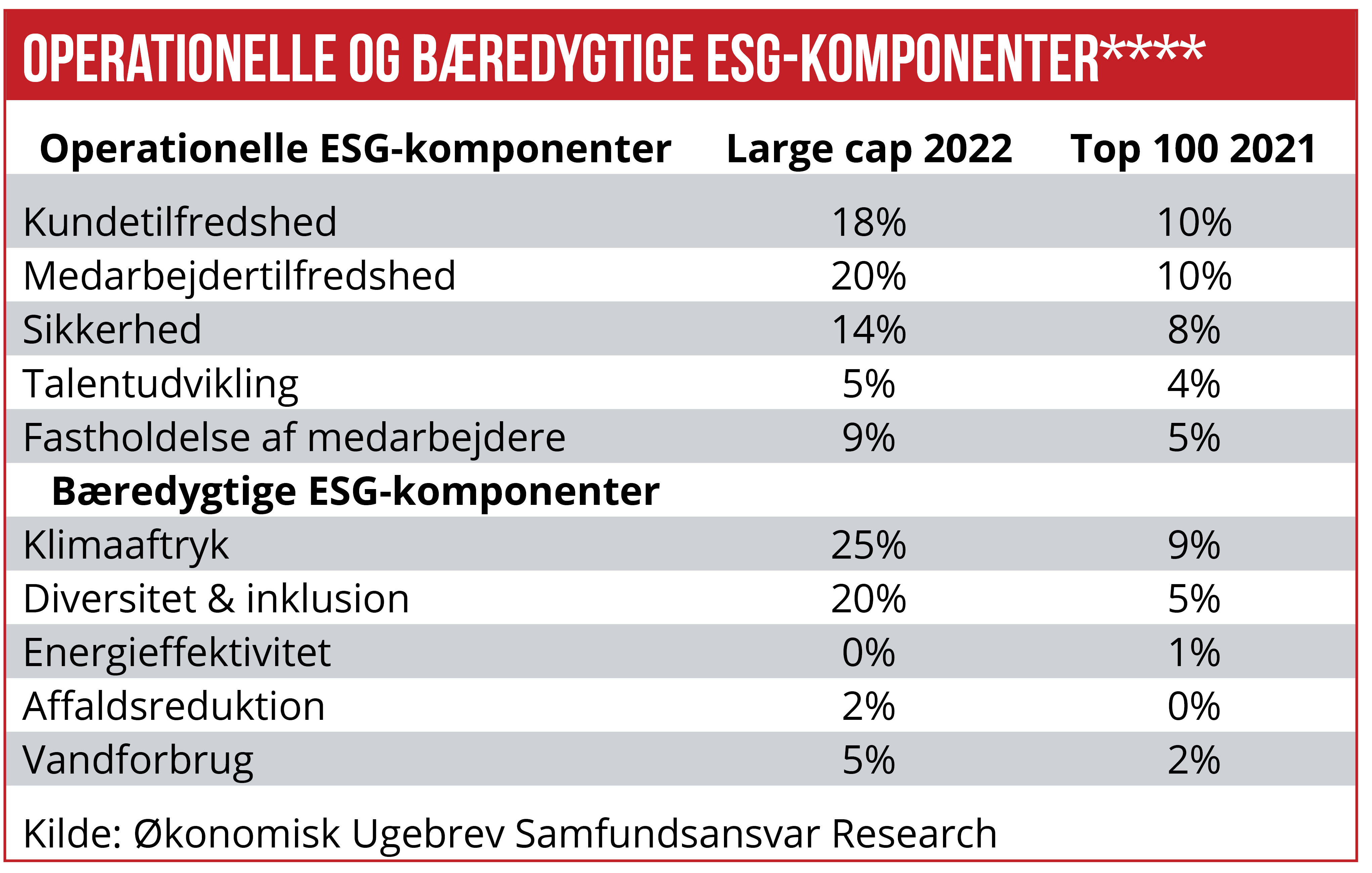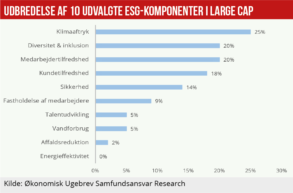 Økonomisk Ugebrevs kortlægning af ESG-komponenter i danske topchefers bonusprogrammer viser, at mere end hver anden large cap-virksomhed har integreret ESG-komponenter i topledelsens bonusprogrammer. Klima indgår i hver fjerde topchefløn i large cap-kategorien. Det bringer store danske børsnoterede virksomheder langt foran deres engelske og amerikanske konkurrenter, der i deres variable lønpakker fokuserer mere på sociale ESG-komponenter som kundetilfredshed og diversitet & inklusion.