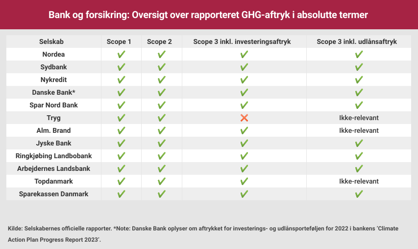 Økonomisk Ugebrevs kortlægning viser, at 12 ud af 12 danske storbanker og forsikringsselskaber nu rapporterer om klimaaftrykket for investeringer og udlån, der udgør langt de største poster i finansielle virksomheders klimaregnskab. Men forsikringsgiganten Tryg skiller sig ud ved at være det eneste selskab, der ikke oplyser om det absolutte klimaaftryk fra selskabets investeringsportefølje. Selskabet oplyser dog om andre relevante klimadata. Niels Arne Dam, cheføkonom i brancheforeningen Finans Danmark, konstaterer, at finanssektoren arbejder intensivt med at rapportere på, hvordan klima påvirkes af de aktiviteter, som sektoren er med til at finansiere. Redaktør Claus Strue Frederiksen har kulegravet selskabernes klimarapporter.