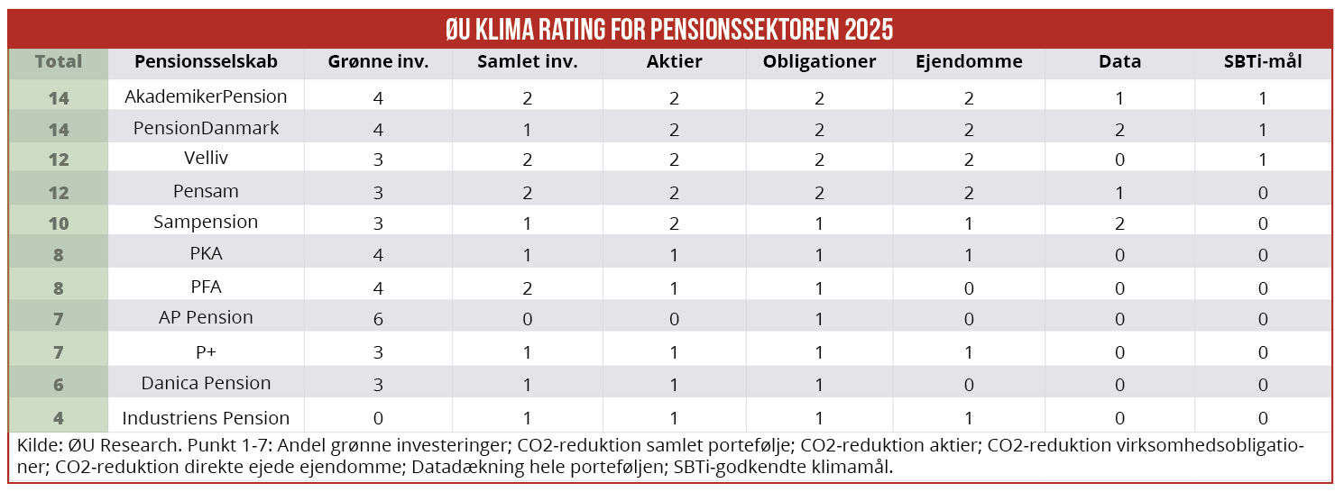 Hovedfokus i ØU Klima Rating for Pensionssektoren er på grønne investeringer og CO2-reduktioner i intensitetsaftrykket for investeringsporteføljen. Ratingen bygger på klimadata, som pensionsselskaberne selv har offentliggjort.