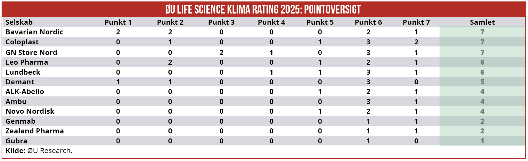 Med udgangspunkt i virksomhedsrapporter udgivet i 2025 har vi indsamlet klimadata fra tolv life science-selskaber og på den baggrund tildelt virksomhederne point for hvert af de syv målepunkter (en mere udførlig beskrivelse af de syv målepunkter og pointtildelingen findes her).