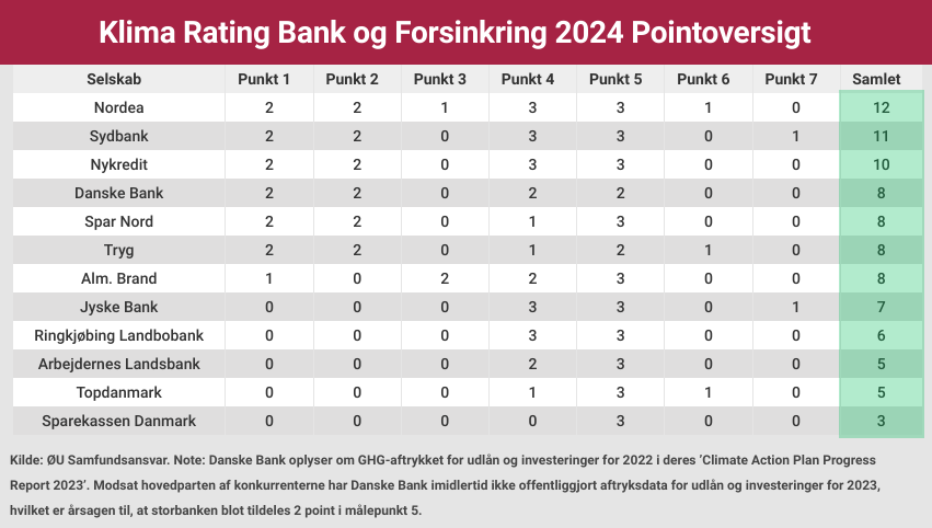 Med udgangspunkt i virksomhedsrapporter udgivet i 2024 har vi indsamlet klimadata fra danske bank- og forsikringsselskaber og på den baggrund tildelt virksomhederne point for hvert af de syv målepunkter (en mere udførlig beskrivelse af de seks målepunkter og pointtildelingen findes her).
