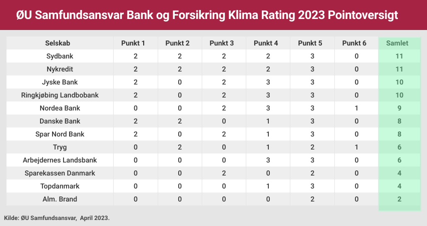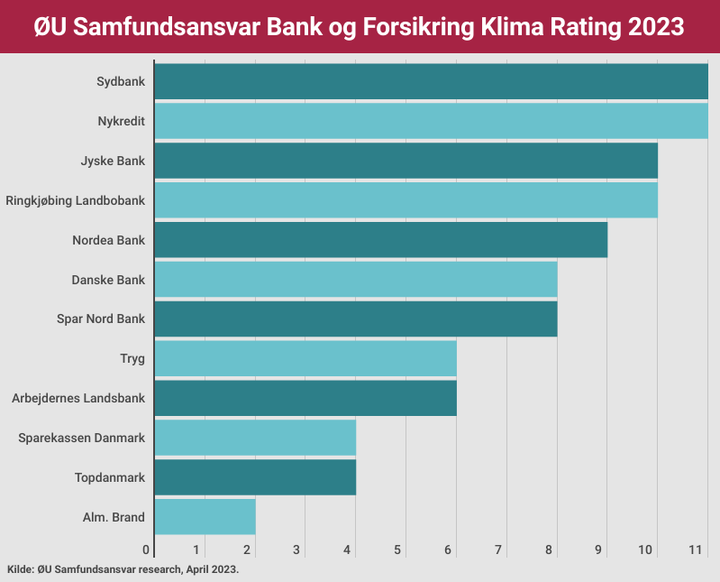 Nykredit og Sydbank vinder Økonomisk Ugebrevs Klima Rating for Bank- og Forsikringsbranchen 2023, begge med 11 point ud af 13 mulige. På en delt andenplads ligger Jyske Bank og Ringkjøbing Landbobank. I bunden af ranglisten ligger Alm. Brand med blot to point ud af 13 mulige. I det hele taget klarer forsikringsbranchen sig ualmindeligt ringe, med et pointgennemsnit på fire, hvilket er under halvdelen af banksektorens scorer, skriver redaktør Claus Strue Frederiksen i denne gennemgang af årets Klima Rating for Bank- og Forsikringsbranchen.