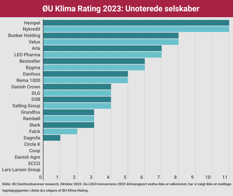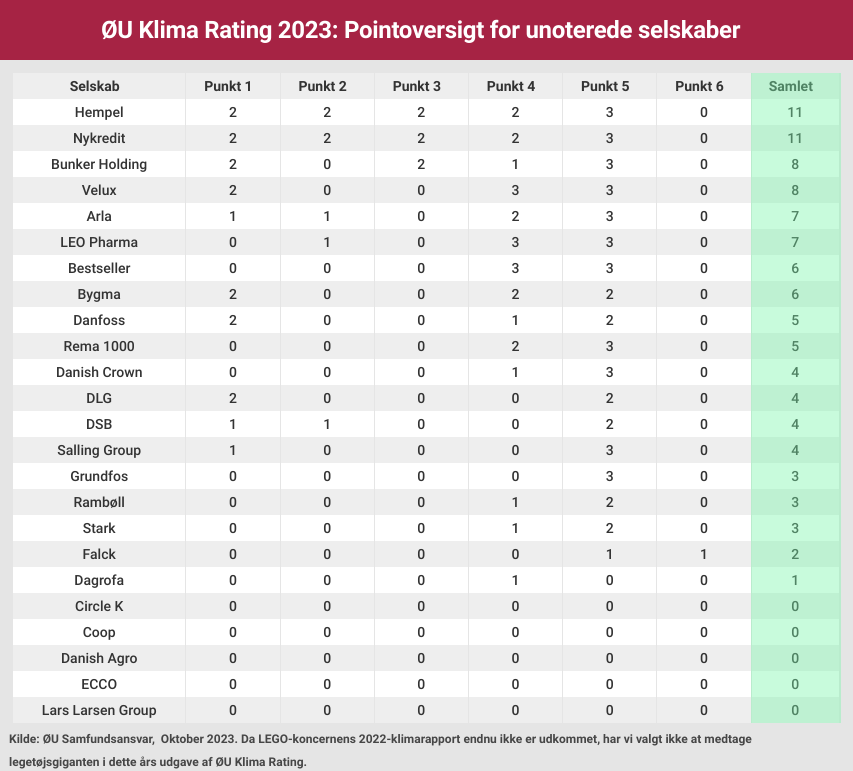 Hempel og Nykredit vinder Økonomisk Ugebrevs Klima Rating for store unoterede selskaber 2023, begge med 11 point ud af 13 mulige. Generelt set klarer de unoterede selskaber sig dårligt, med en gennemsnitsscore lidt over 4 – til sammenligning er snittet for C25 knap 7 point. Fem af de store unoterede selskaber, herunder ECCO og Lars Larsen Group, kommer slet ikke på tavlen og ender med en samlet score på nul point. Den ringe pointhøst skyldtes i mange tilfælde mangelfuld klimarapportering, skriver Claus Strue Frederiksen i denne gennemgang af årets Klima Rating for store danske unoterede selskaber.