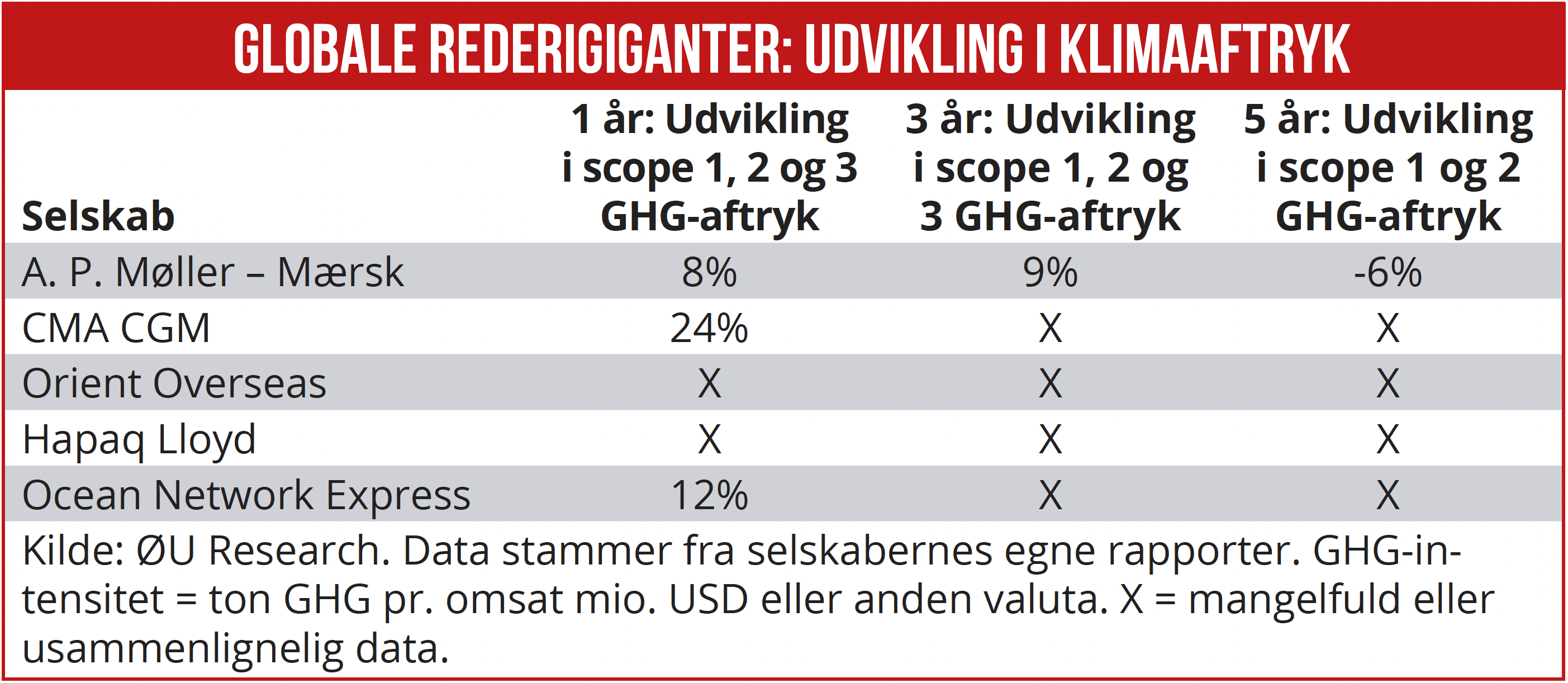 Økonomisk Ugebrev har undersøgt, hvordan A. P. Møller – Mærsk klarer sig på klimaområdet i forhold til fire internationale peers: CMA CGM , Hapaq Lloyd, Orient Overseas og Ocean Network Express.