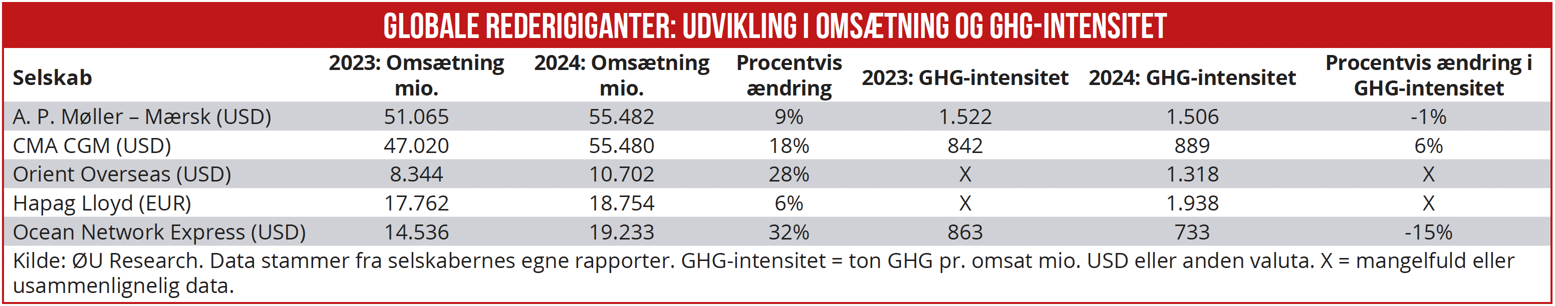 * A. P. Møller – Mærsk ændrer jævnligt metode til at beregne GHG-aftryk. I samtlige års- og bæredygtighedsrapporterne 2020-24 oplyser den danske rederigigant, at GHG-data er blevet ændret bagudrettet grunder ny og forbedret beregningsmetode. Vi har i ovenstående benyttet data fra senest mulig års- eller bæredygtighedsrapport.