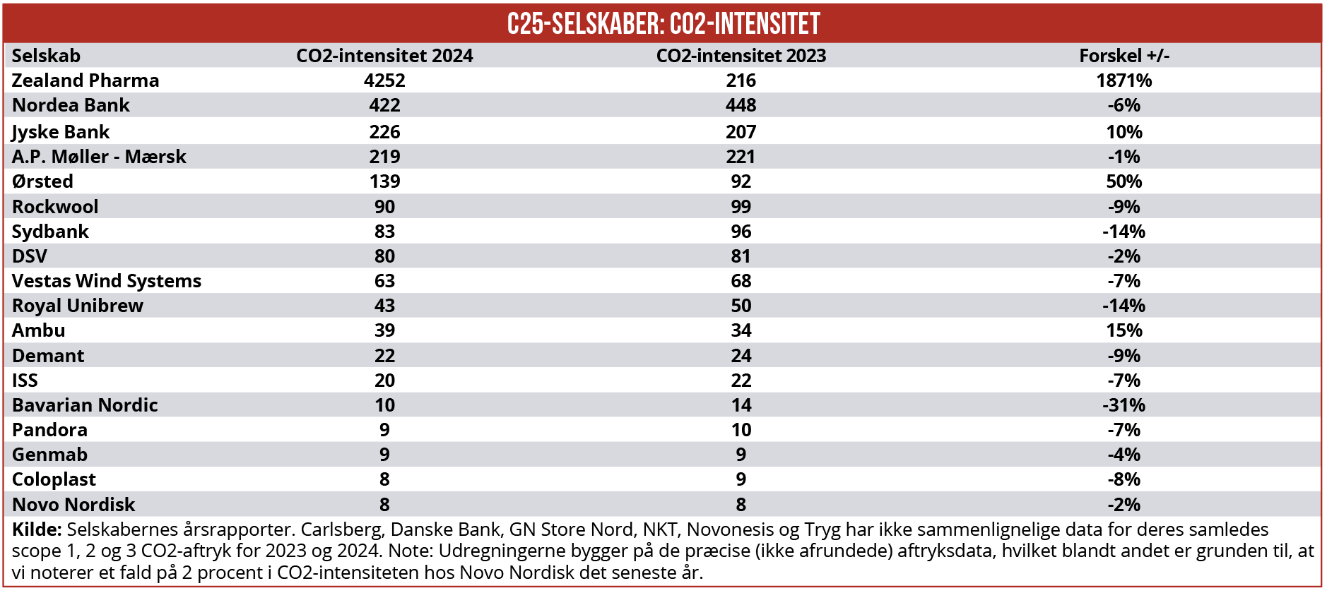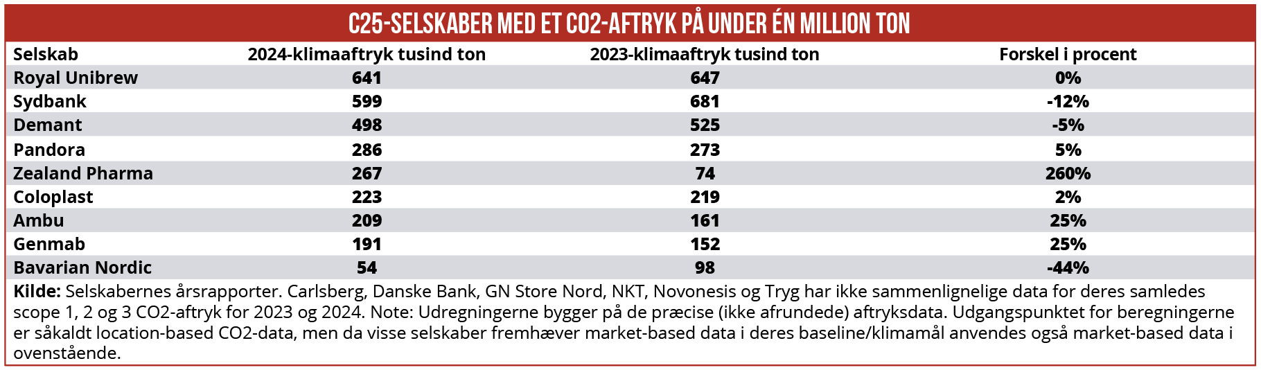 * Artiklen er 6. marts blevet opdateret med data for Bavarian Nordic. Desuden skal bemærkes, at Carlsberg, Danske Bank, GN, NKT, Novonesis og Tryg har ikke sammenlignelige data for deres samledes scope 1, 2 og 3 CO2-aftryk for 2023 og 2024. Klimaaftrykket for disse selskaber indgår derfor ikke i denne artikel. Oprindeligt indgik GN’s data i artiklen, men selskabet meddelte tirsdag eftermiddag ØU, at GN’s aftryksdata for 2024 ikke kan sammenlignes med 2023. Artiklen er derfor blevet opdateret, således at GN’s aftryksdata ikke længere indgår artiklen. Artiklen er desuden blevet opdateret med nyt data for Royal Unibrew.