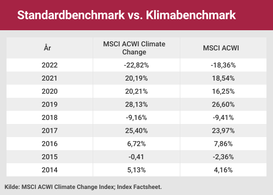 Lægernes Pensions aktieportefølje tager udgangspunkt i MSCI ACWI Climate Change Index, der har MSCI ACWI som moderindeks. Som det fremgår af tabellen, har klimaindekset i syv ud af de seneste ni år givet et bedre afkast end dets moderbenchmark. Men sidste år så det anderledes ud, da klimabenchmarket præsterede betydeligt dårligere end moderbenchmarket (en mere udførlig forklaring om hvordan MSCI designer klimabenchmarks findes her).*