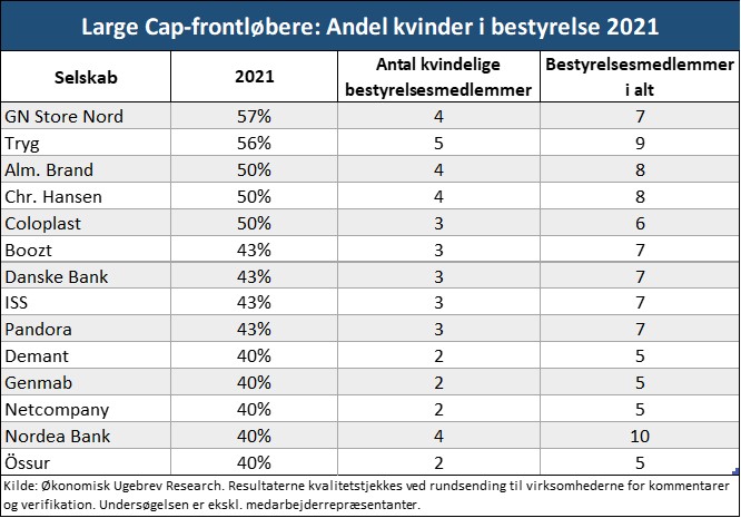 Modsat har headset- og høreapparatsvirksomhed GN Store Nord og forsikringsselskabet Tryg henholdsvis 57 og 56 procent kvinder i deres bestyrelse. Kvinderne er altså i overtal i to ud af 44 danske large cap-selskabers bestyrelser.