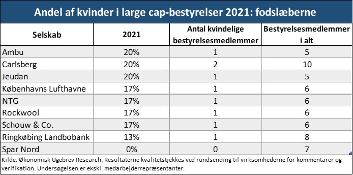 Selvom large cap-selskaber generelt klarer sig bedre end både mid cap og de store unoterede selskaber, findes der stadig en håndfuld large cap-selskaber med en yderst beskeden andel kvindelige bestyrelsesmedlemmer. Spar Nord skraber bunden med nul kvindelige bestyrelsesmedlemmer. Men også i virksomheder som Ambu, Carlsberg, Jeudan, Rockwool og Schouw & Co. er kvindelige bestyrelsesmedlemmer et særsyn.