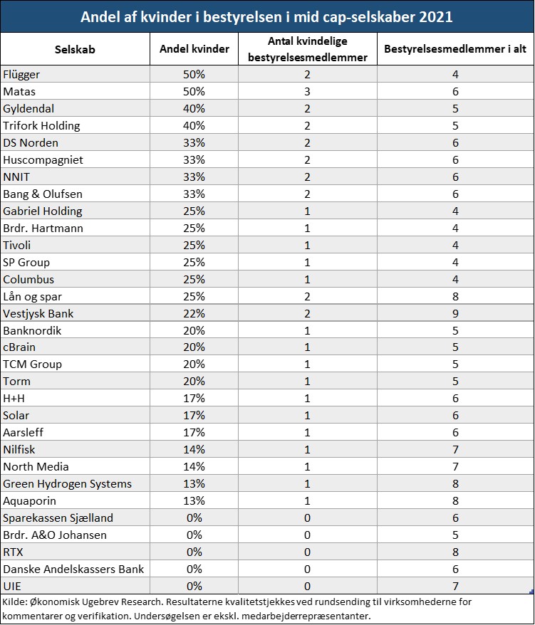 Som de eneste to danske mid cap-selskaber har Flügger og Matas en bestyrelse med lige så mange kvinder som mænd. På de næste pladser ligger Gyldendal og Trifork Holding – begge med 40 procent kvinder i bestyrelsen.