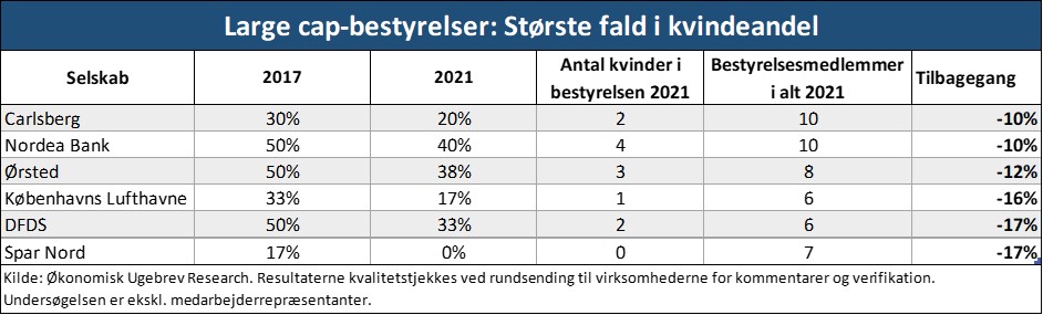 Siden 2017 har seks large cap-selskaber reduceret andelen af kvinder i bestyrelsen betydeligt, her forstået som en reduktion på ti procent eller derover.* Den største tilbagegang står DFDS og Spar Nord for. I 2017 var hvert andet bestyrelsesmedlem i DFDS en kvinde, i 2021 var det faldet til hver tredje. I samme periode er DFDS dog gået fra nul kvinder i den daglige topledelse til, at det nu er hver tredje.