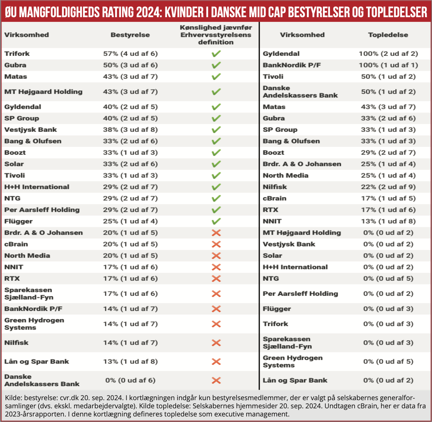 * En væsentlig del af topledelserne i mid cap-segmentet består af mindre end tre personer, hvorved de ikke er omfattet af Erhvervsstyrelsens definition af kønslighed. Erhvervsstyrelsen skriver: ”En ligelig kønsfordeling i lovens forstand kræver en fordeling på 40/60 pct., hvilket forudsætter tilstedeværelse af minimum 3 personer.” Vi har derfor ikke opgjort, hvor mange af mid cap-selskabernes topledelser, der har kønslighed jævnfør Erhvervsstyrelsens definition.