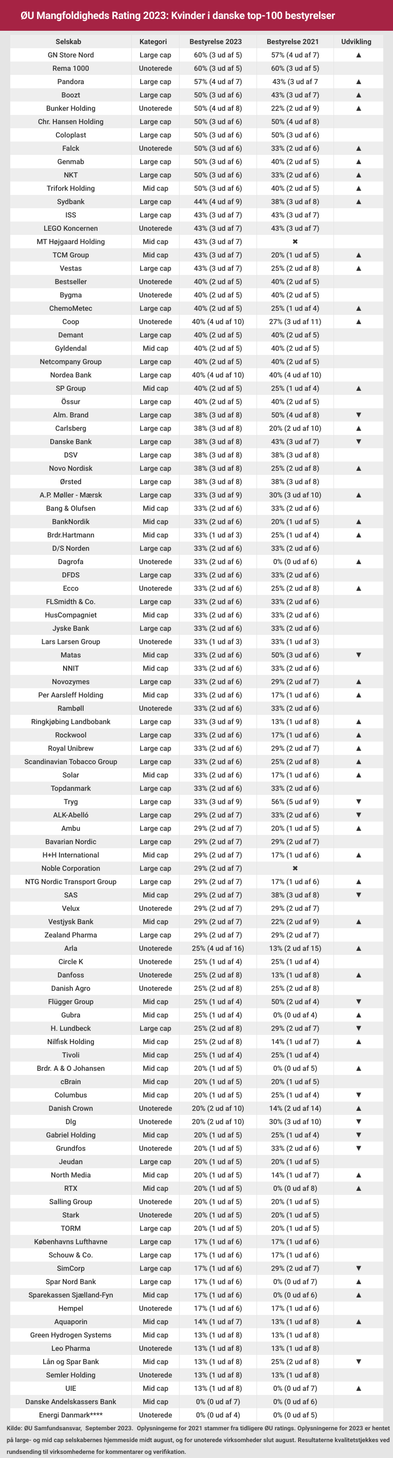 Siden 2021 har 44 danske top-100* selskaber øget andelen af kvinder i bestyrelsen. Af disse har syv selskaber – Bunker Holding, Dagrofa, Gubra, Ringkjøbing Landbobank, RTX og TCM Group – øget andelen af kvindelige bestyrelsesmedlemmer de seneste to år med mindst 20 procent.