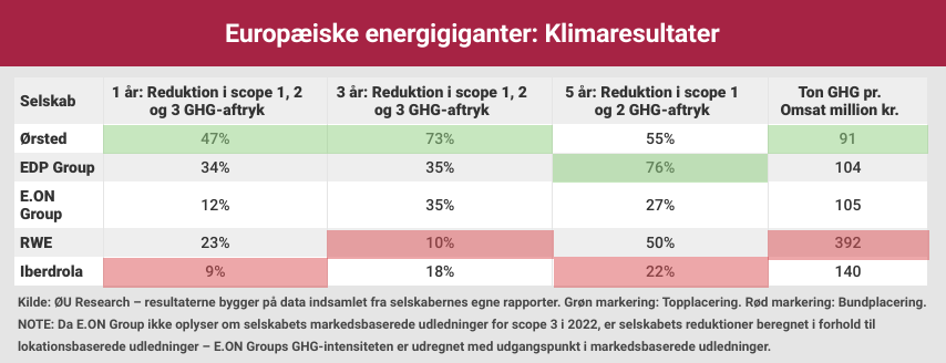 Ørsted slår internationale peers som E.ON, RWE og Iberdrola på centrale klimamålepunkter. En undersøgelse udarbejdet af Økonomisk Ugebrev viser, at Ørsted har reduceret sit klimaaftryk betydeligt mere end konkurrenterne, både på kort og mellemlangt sigt. Ørsted har også det laveste intensitetsaftryk i peer gruppen. Eksempelvis udleder tyske RWE fire gange mere drivhusgas end Ørsted pr. omsat million kroner. Redaktør Claus Strue Frederiksen indleder her en artikelserie, hvor store danske selskabers klimaresultater sammenlignes med internationale peers.
