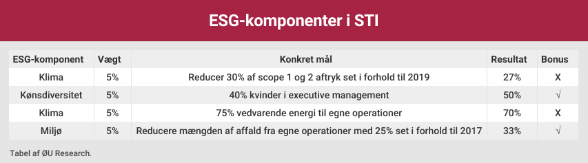 Yderligere info: ESG-komponenter skal her forstås i bred forstand. Så længe selskabet enten (a) selv eksplicit omtaler det ikke-finansielle målepunktet som hørende under ESG, bæredygtighed eller samfundsansvar eller (b) målepunktet åbenlyst hører til under ESG-paraplyen, hvilket eksempelvis gælder for klima og kønsdiversitet.
