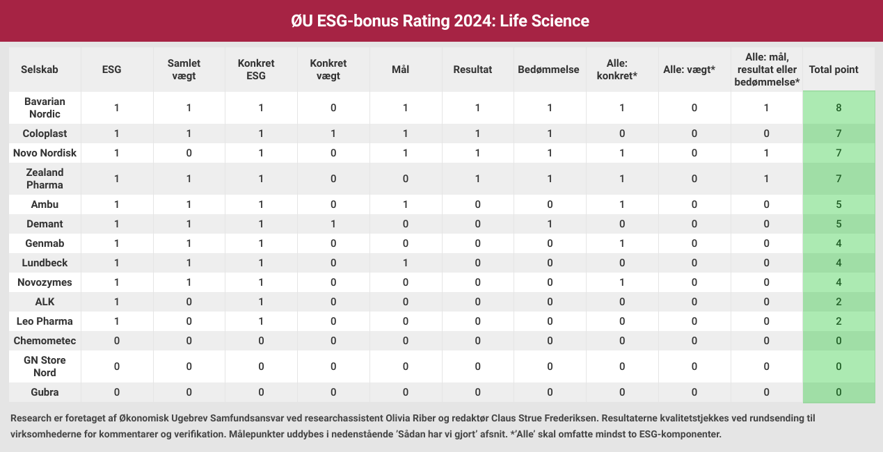 Økonomisk Ugebrevs årlige Rating af ESG-komponenter i topchefbonus viser, at 11 ud af 14 danske life science selskaber har integreret ESG i bonusprogrammet. I toppen af ratingen ligger Bavarian Nordic, hvor CEO Paul Chaplins bonus er knyttet til seks specifikke ESG-mål, herunder mål for kønsdiversitet og klimarapportering. I den anden ende af skalaen ligger ALK, der nøjes med at meddele, at topchefens bonusprogram indeholder mål om f.eks. klima og affaldshåndtering, uden at uddybe de konkrete målsætningerne. Redaktør Claus Strue Frederiksen præsenterer her rating-resultatet for life science-sektoren.