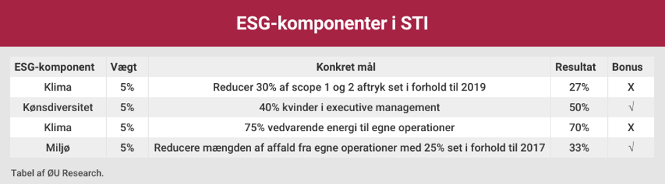 Yderligere info: ESG-komponenter skal her forstås i bred forstand. Så længe selskabet enten (a) selv eksplicit omtaler det ikke-finansielle målepunktet som hørende under ESG, bæredygtighed eller samfundsansvar eller (b) målepunktet åbenlyst hører til under ESG-paraplyen, hvilket eksempelvis gælder for klima og kønsdiversitet.