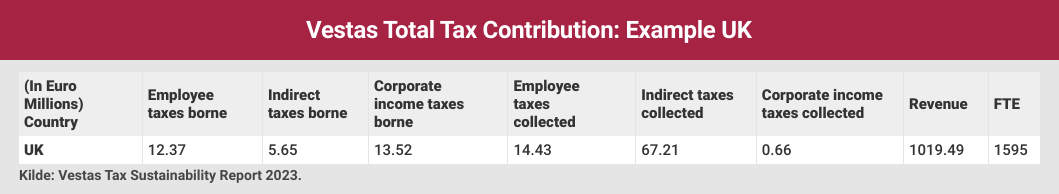 Eksempel 2: I selskabets omfangsrige skatterapport for 2023 præsenterer Vestas en oversigt over selskabets skattebidrag i samtlige lande, som vindmølleproducenten opererer i. Oversigten er fordelt på seks skattearter, heraf tre opkrævede og tre afholdte. Nedenstående tabel er et udklip fra oversigten, med UK som eksempel. Dette oplysningsniveau for samtlige lande vil resultere i ekstrapoint i målepunkt 8.