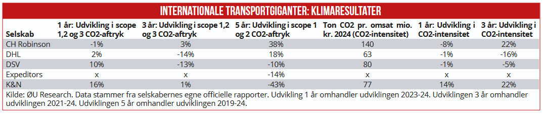 På trods af lavere omsætning har konkurrenterne, amerikanske CH Robinson og schweiziske Kuehne+Nagel, ikke formået at sænke deres klimaaftryk fra 2021 til 2024. Tværtimod har de to transportgiganter øget både det absolutte CO2-aftryk samt intensitetsaftrykket.
