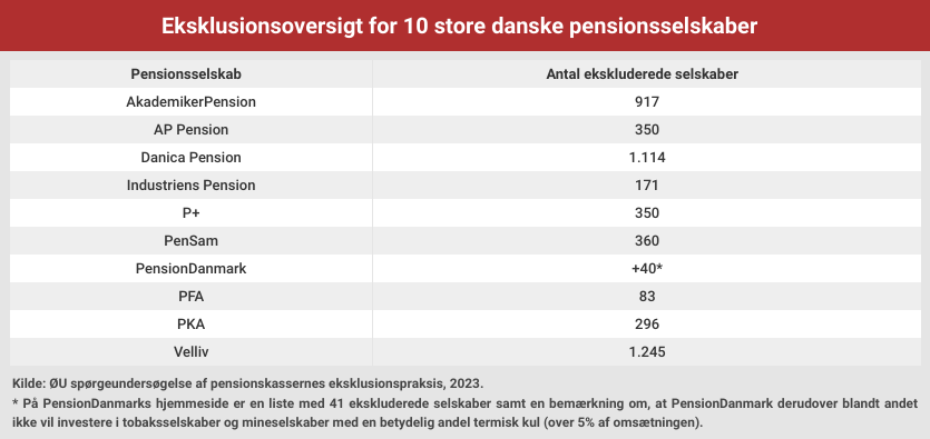 Som det fremgår af nedenstående tabel, har de fleste store danske pensionsselskaber ekskluderet væsentligt flere selskaber end Norges Bank – ligesom Norges Bank skyldtes eksklusionerne på lange stræk klima, tobak og kontroversielle våben.