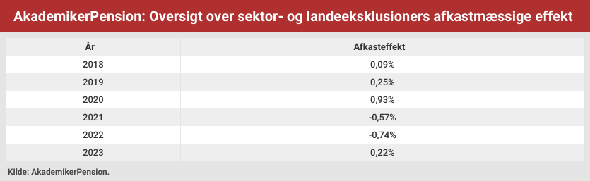 ”Vi kan oplyse mindre konkret, at vi har regnet på dette i en årrække og at afkastpåvirkningen har svinget mellem positiv og negativ fra år til år og over den samlede periode har eksklusionerne givet et lille plus på afkastet.”