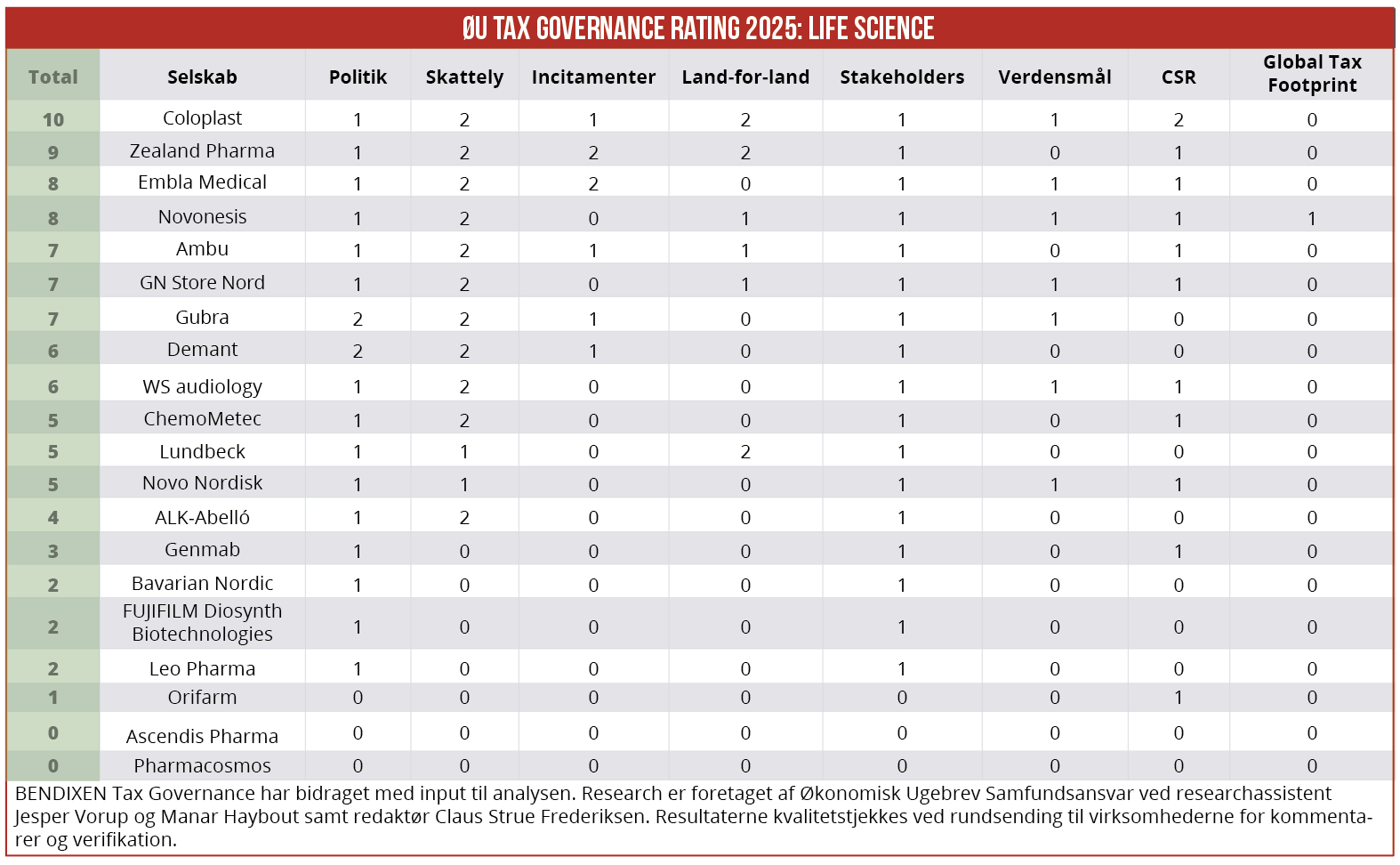 BENDIXEN Tax Governance har bidraget med input til analysen. Research er foretaget af Økonomisk Ugebrev Samfundsansvar ved researchassistent Jesper Vorup og Manar Haybout samt redaktør Claus Strue Frederiksen.