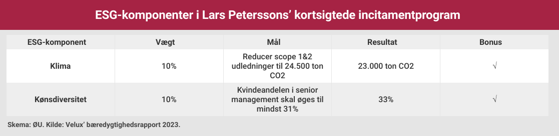 Ifølge Velux’ seneste bæredygtighedsrapport indeholder CEO Lars Peterssons’ kortsigtede bonusprogram to ESG-komponenter, der hver især vægter 10 procent af programmet, altså i alt tyve procent, hvilket er relativt meget.