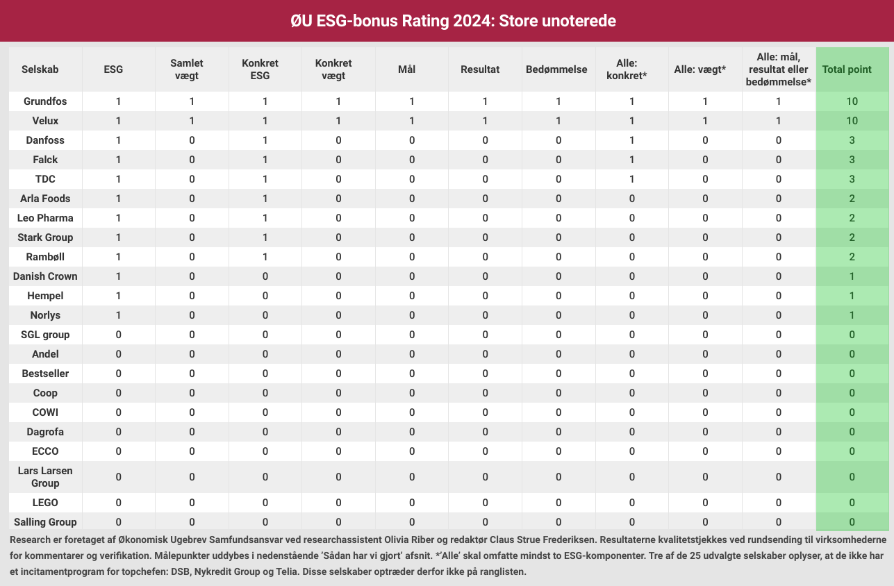 Med 10 point ud af 10 mulige vinder Grundfos og Velux suverænt Økonomisk Ugebrevs rating af ESG-komponenter i topchefbonus for store unoterede selskaber. Pointmæssigt er der langt ned til andenpladsen, hvor Danfoss, Falck og TDC ligger – alle med blot tre point.